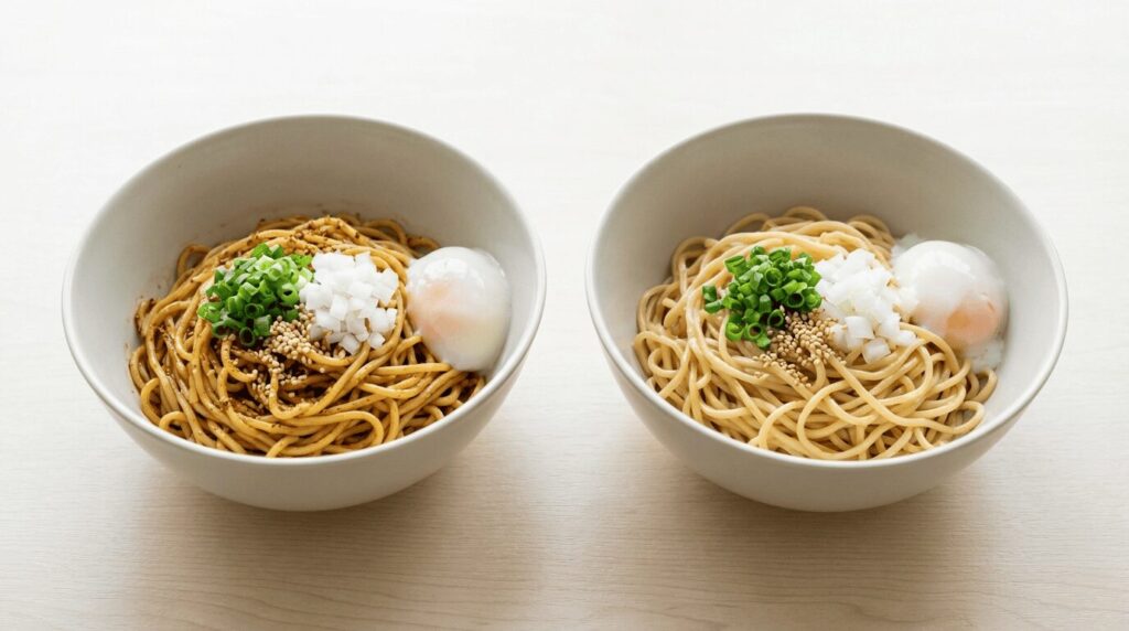 湯気がこもったままだと麺の表面がベタつきやすい。少し逃がすだけで食感が整います。 - 麺をほぐしてから“底から大きく混ぜる”